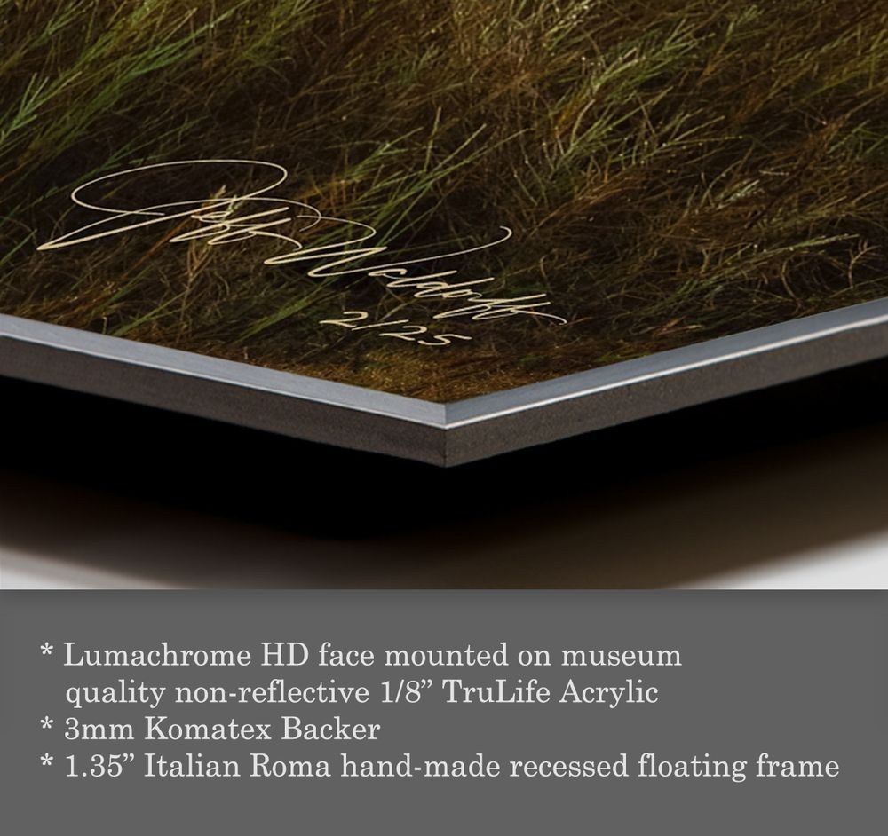 The most incredible gallery quality finished pieces available today. These are original Lumachrome HD photo prints under TruLife®Acrylic glass. The museum quality pieces are produced using the best available materials in the world today and are my top recommendation to my clients.